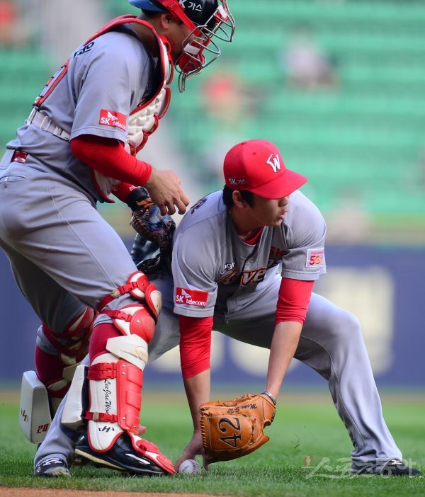 29일 서울 잠실야구장에서 ‘2017 타이어뱅크 KBO리그’ 두산 베어스와 SK 와이번스의 경기가 열렸다. 1회말 무사 1루에서 두산 류지혁의 번트 타구를 SK 선발 문승원이 볼을 빠뜨리며 송구 실책을 범하고 있다.