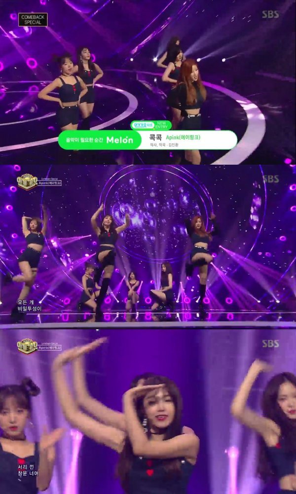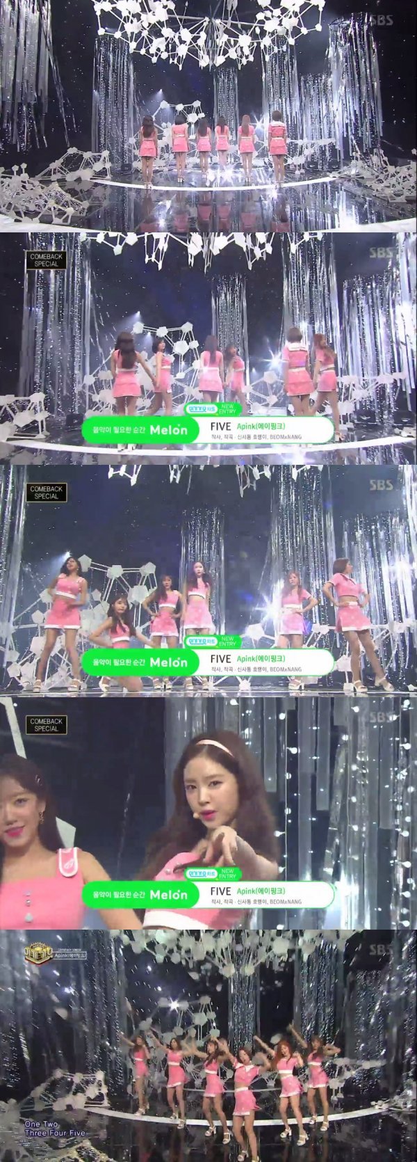 2일 오후 방송된 SBS 프로그램 ‘인기가요’에서는 에이핑크가 ‘FIVE’(파이브)와 ‘콕콕’으로 컴백 무대를 꾸미는 장면이 그려졌다.