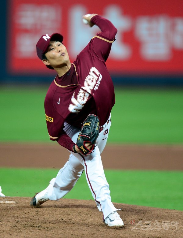 2일 경기도 수원 kt위즈파크에서 ‘2017 타이어뱅크 KBO리그’ kt 위즈와 넥센 히어로즈의 경기가 열렸다. 넥센 선발 투수 김성민이 힘차게 볼을 던지고 있다.