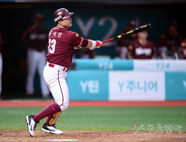2일 경기도 수원 kt위즈파크에서 ‘2017 타이어뱅크 KBO리그’ kt 위즈와 넥센 히어로즈의 경기가 열렸다. 3회초 2사 1, 2루에서 넥센 윤석민이 2타점 2루타를 치고 있다.