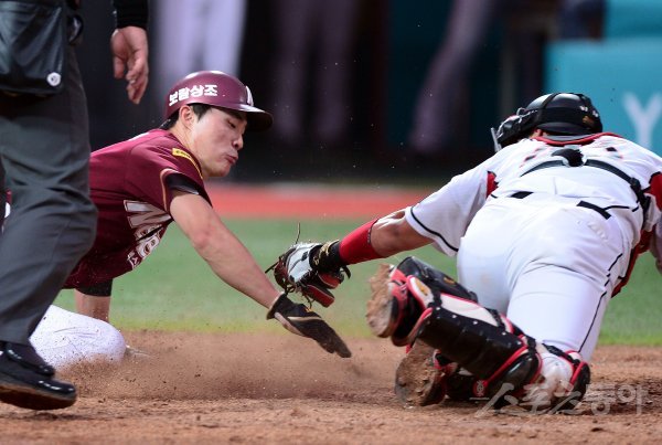 2일 경기도 수원 kt위즈파크에서 ‘2017 타이어뱅크 KBO리그’ kt 위즈와 넥센 히어로즈의 경기가 열렸다. 4회초 2사 1, 2루에서 넥센 김민성의 1타점 2루타 때 1루 주자 김하성이 홈으로 파고들다 kt 이해창에게 태그 아웃되고 있다.