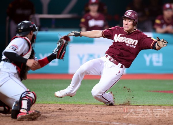 2일 경기도 수원 kt위즈파크에서 ‘2017 타이어뱅크 KBO리그’ kt 위즈와 넥센 히어로즈의 경기가 열렸다. 4회초 2사 1, 2루에서 넥센 김민성의 1타점 2루타 때 1루 주자 김하성이 홈으로 파고들다 kt 이해창에게 태그 아웃되고 있다.