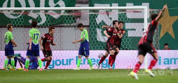 5일 서울월드컵경기장에서 열린 ‘KEB 하나은행 K리그 클래식 2017’ 전북현대와 FC서울 경기에서 전반 서울 윤승원(22번)이 선제골을 성공시킨 후 박주영과 기뻐하고 있다.