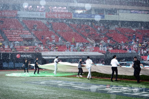 2일 경기도 수원 kt위즈파크에서 ‘2017 타이어뱅크 KBO리그’ kt 위즈와 넥센 히어로즈의 경기가 열렸다. 6회말 무사 1루에서 kt 이대형 타석 때 폭우로 우천 중단되자 구단 관계자들이 그라운드에 방수포를 덮고 있다.