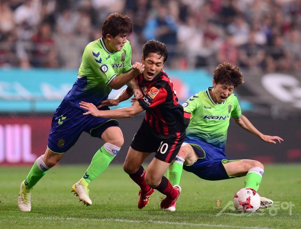 5일 서울월드컵경기장에서 열린 ‘KEB 하나은행 K리그 클래식 2017’ 전북현대와 FC서울 경기에서 서울 박주영과 전북 이재성이 볼다툼을 하고 있다.