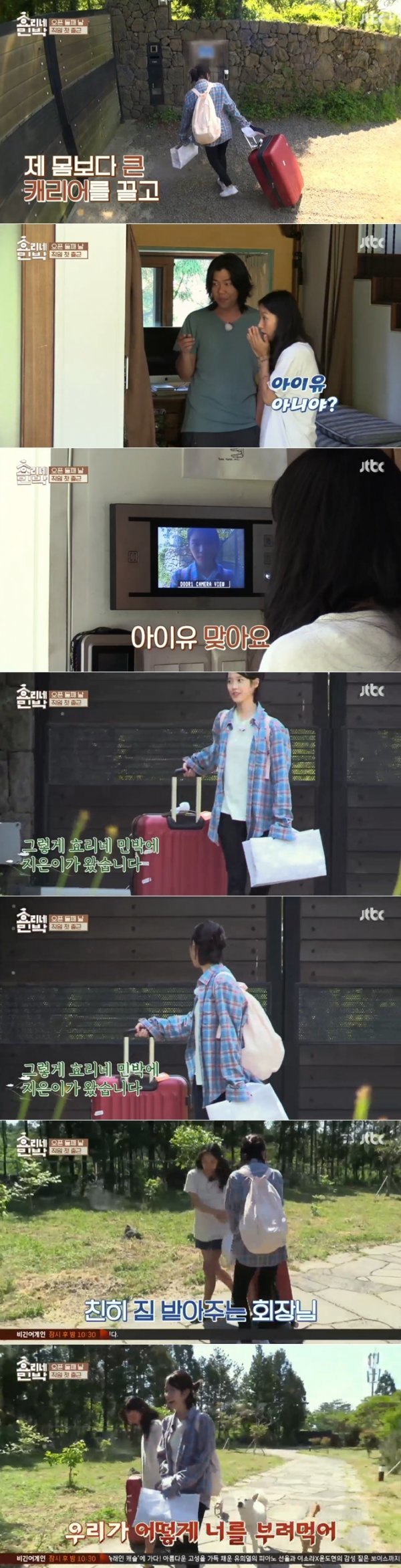 이날 이효리는 두 번째 손님인 탐험가 듀오를 맞았다. 이들과 도란도란 이야기를 나누던 이효리 이상순은 갑자기 울린 초인종에 화들짝 놀랐다. 직원으로 온 사람은 가수 아이유. 이효리는 개 짓는 소리에 아이유가 놀랄까봐 뛰어나갔다. 이효리는 “네가 직원으로 온 거냐. 말도 안 된다. 우리가 어떻게 너를 부리냐”고 말하면서도 반가운 마음을 숨기지 못했다. 아이유는 “2주 정도 있을 예정이다. 막 부리셔도 된다”고 말했다.