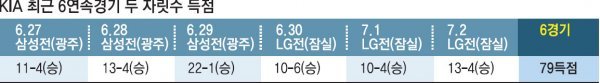 KIA는 6월27일 광주 삼성전부터 7월2일 잠실 LG전까지 KBO리그 사상 최초로 6연속경기 두 자릿수 득점을 올렸다. 이 기간 팀타율 0.403에 79득점을 올렸다. 시즌 팀타율은 어느새 3할대(0.304)로 올라서며 단독 1위가 됐다.
