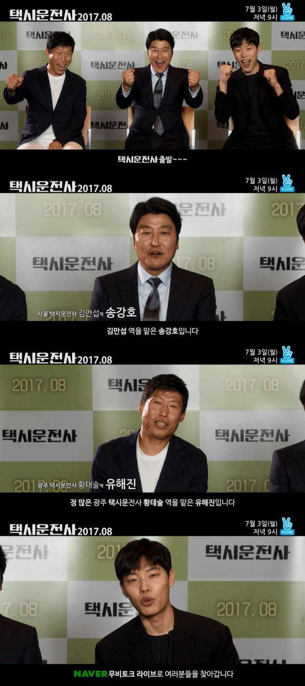 송강호, 유해진, 류준열, 장훈 감독까지 ‘택시운전사’ 의 주역들이 한 자리에 모이는 이번 네이버 무비토크 라이브는 네이버 V앱 생중계를 통해 예비 관객들을 만날 예정이다.