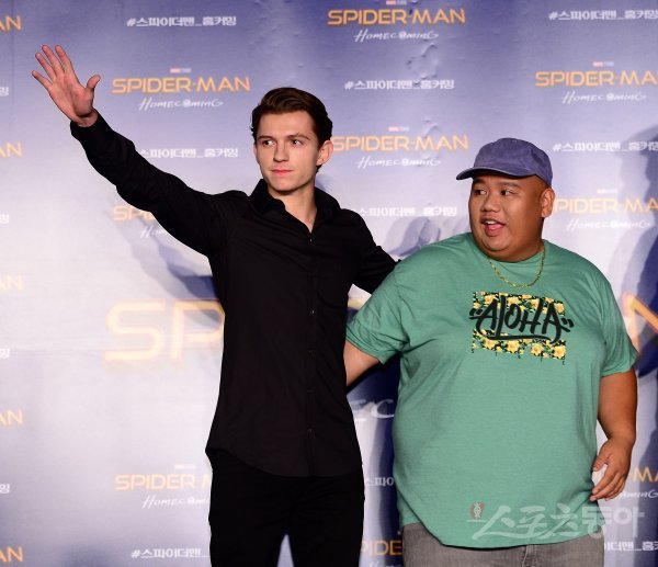 3일 서울 영등포구 여의도동 콘래드 서울 호텔에서 영화 ‘스파이더맨 : 홈커밍’ 내한 기자회견이 열렸다. 배우 톰 홀랜드와 제이콥 배덜런(오른쪽)이 포토타임 중 인사를 하고 있다.