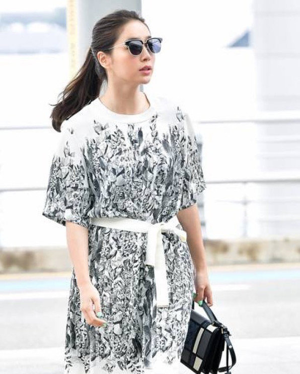 이민정은 깔끔한 포니테일 헤어스타일에 크고 화려한 프린팅이 들어있는 흰 원피스를 입고 허리에는 리본을 묶어 포인트를 줬다. 얼굴보다 큰 선글라스를 매치해 스타일리시함을 강조했다.