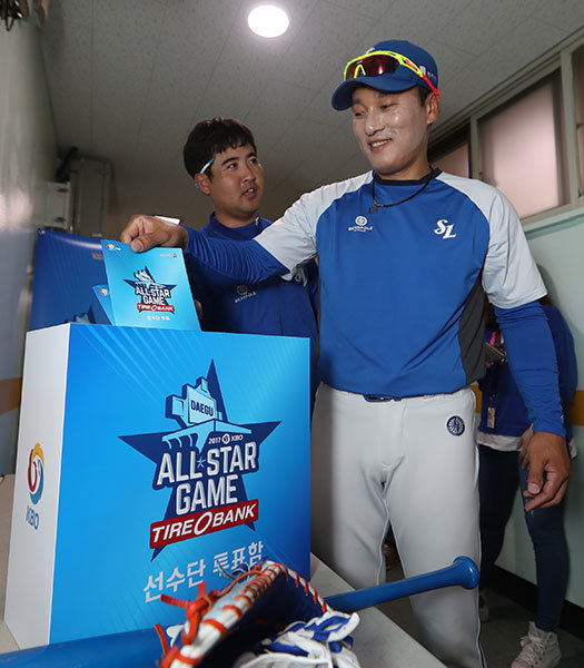 21일 서울 송파구 잠실야구장에서 열린 ‘2017 프로야구 KBO리그’ LG 트인스와 삼성 라이온즈의 경기에 앞서 삼성 장원삼, 이승엽이 올스타전 선수단 투표를 하고 있다. 사진제공|스포츠코리아