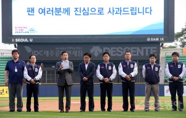 4일 잠실야구장에서 ‘2017 타이어뱅크 KBO 리그’ kt위즈와 두산베어스의 경기가 열렸다. 경기 전 최근 두산 고위관계자와 심판의 돈거래 사건으로 논란이 된 것에 대해 두산 전풍 신임 대표이사, 김태룡 단장, 김정수 상무와 프런트들이 사과문을 발표하고 있다.
