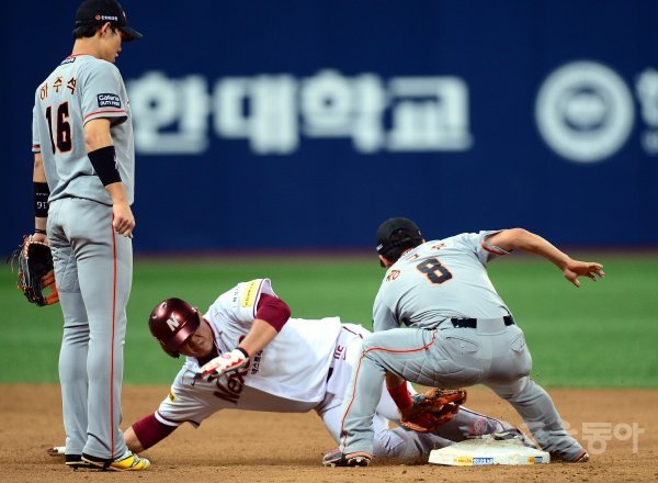 4일 서울 고척 스카이돔에서 ‘2017 타이어뱅크 KBO리그’ 넥센 히어로즈와 한화 이글스의 경기가 열렸다. 3회말 1사 2, 3루에서 넥센 허정협의 내야 땅볼 때 2루 주자 박윤이 한화 정근우의 태그를 피하며 황급히 귀루하고 있다.