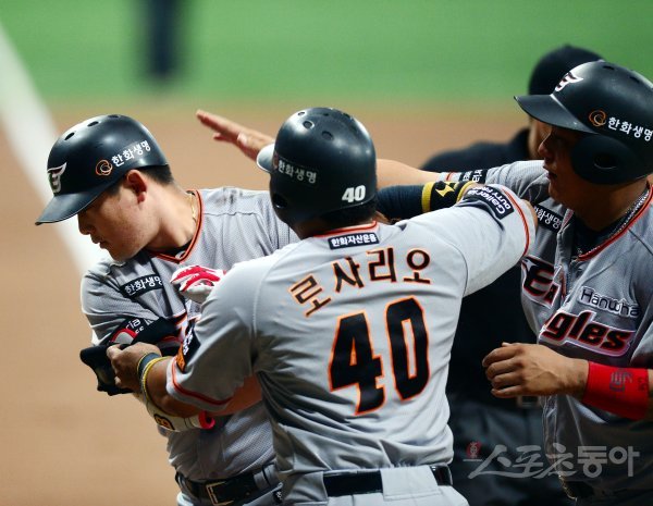 4일 서울 고척 스카이돔에서 ‘2017 타이어뱅크 KBO리그’ 넥센 히어로즈와 한화 이글스의 경기가 열렸다. 1회초 2사 2, 3루에서 나환 이성열이 넥센 선발 브리검을 상대로 좌월 3점 홈런을 쏘아올린 뒤 동료들의 환영을 받고 있다.