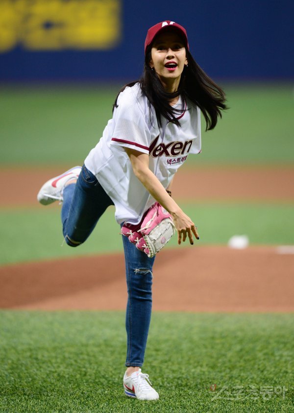 4일 서울 고척 스카이돔에서 ‘2017 타이어뱅크 KBO리그’ 넥센 히어로즈와 한화 이글스의 경기가 열렸다. 경기전 배우 송지효가 시구를 던지고 있다.