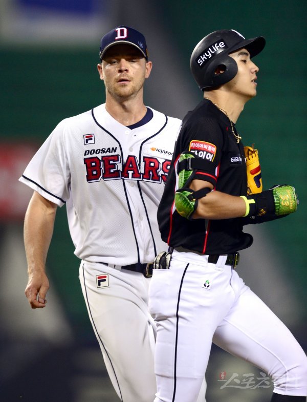 4일 잠실야구장에서 ‘2017 타이어뱅크 KBO 리그’ kt위즈와 두산베어스의 경기가 열렸다. 선발 투수로 등판한 두산 보우덴이 6회초 1사 kt 이대형의 땅볼 타구를 잡아 태그 아웃시키고 있다.
