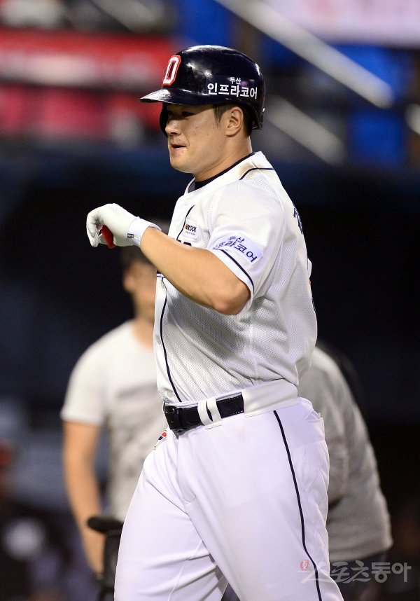 4일 잠실야구장에서 ‘2017 타이어뱅크 KBO 리그’ kt위즈와 두산베어스의 경기가 열렸다. 5회말 2사 1루 두산 김재환이 좌월 투런 홈런을 날리고 그라운드를 돌아 홈인해 하이파이브 하고 있다.