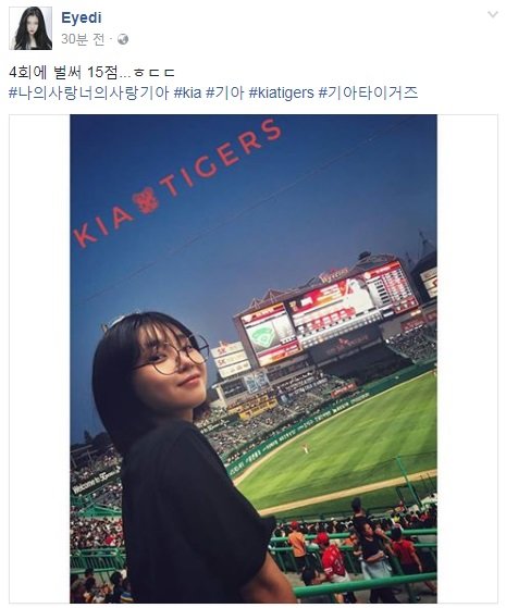 이날 KIA가 경기 초반부터 대량 득점하며 크게 앞서자 아이디는 “4회에 벌써 15점, 나의사랑 너의사랑 기아타이거즈”라는 글을 남기며 KIA 팬임을 인증했다.