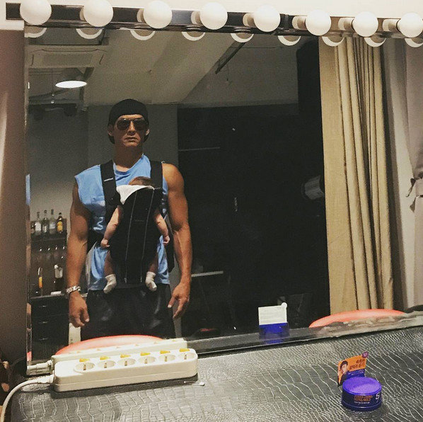 사진 속 박준형은 검은 선글라스를 낀 채로 아기띠를 두르고 비장한 포즈를 취하며 탄탄한 근육으로 건강미도 과시했다.