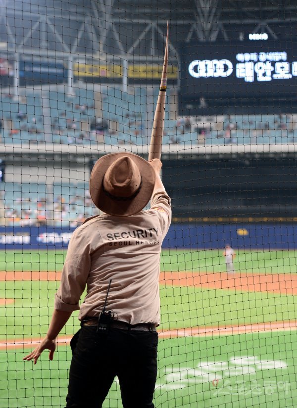 5일 서울 고척 스카이돔에서 ‘2017 타이어뱅크 KBO리그’ 넥센 히어로즈와 한화 이글스의 경기가 열렸다. 1회말 1사 1루에서 넥센 채태인의 안타 때 배트가 부러지며 그물망에 걸리자 구단 관계자가 정리하고 있다.
