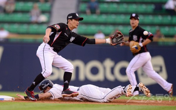 5일 잠실야구장에서 ‘2017 타이어뱅크 KBO 리그’ kt위즈와 두산베어스의 경기가 열렸다. 3회말 2사 1루 상황에서 1루주자 박세혁이 2루 도루에 성공하고 있다.