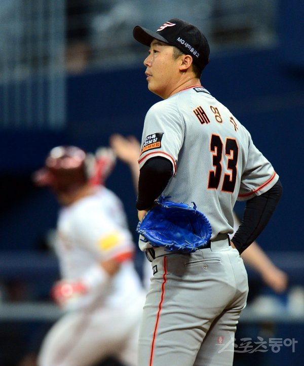 5일 서울 고척 스카이돔에서 ‘2017 타이어뱅크 KBO리그’ 넥센 히어로즈와 한화 이글스의 경기가 열렸다. 2회말 2사 1루에서 넥센 박동원에게 동점 투런포를 허용한 한화 선발 배영수가 아쉬워하고 있다.