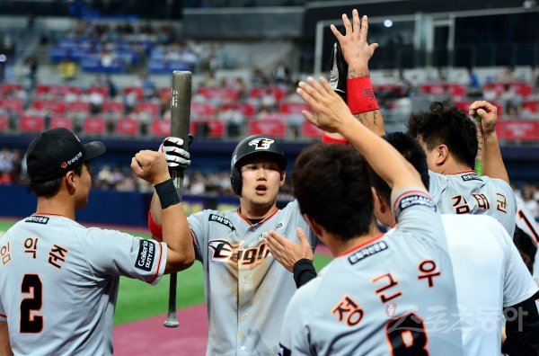 5일 서울 고척 스카이돔에서 ‘2017 타이어뱅크 KBO리그’ 넥센 히어로즈와 한화 이글스의 경기가 열렸다. 5회초 2사 1, 2루에서 한화 이성열의 적시타 때 득점에 성공한 하주석이 동료들의 환영을 받고 있다.