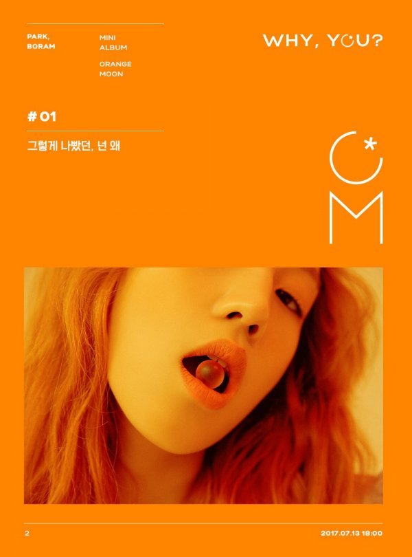 공개된 사진에는 오렌지색 바탕에 ‘PARK BORAM MINI ALBUM ORANGE MOON’이라는 문구와, 오렌지빛 컬러로 머리를 염색한 박보람의 색다른 모습이 담겨있어 눈길을 끈다.