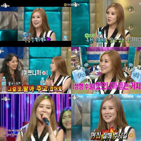 5일 밤 방송된 MBC ‘라디오스타’에 ‘보스 시스터즈, 전설의 언니들’ 특집에서 가수 이효리와 가희, 브라운아이드걸스 나르샤와 함께 출연해 재치있는 예능감과 입담을 펼쳤다.