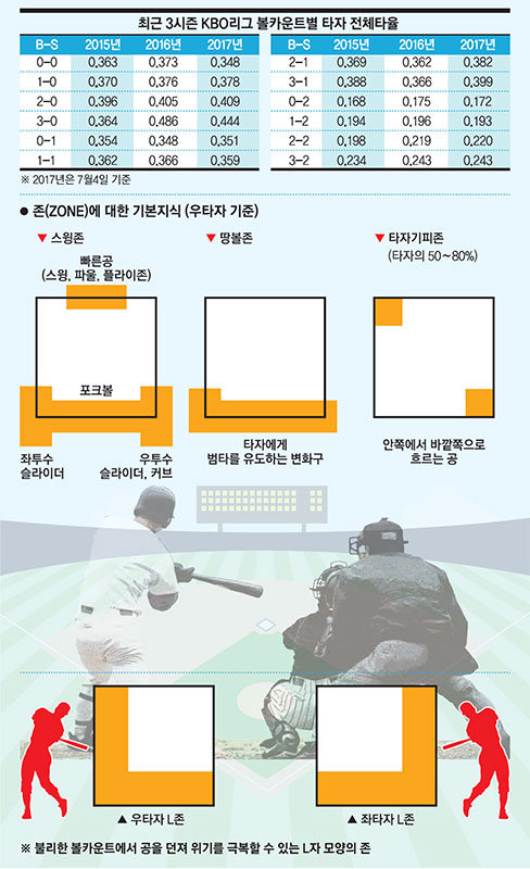 A : 볼카운트에 따른 볼 배합을 말씀드리기 위해 최근 3년 볼카운트별 KBO리그 전체타자 타율 자료가 필요했습니다. 표를 통해 알 수 있듯 볼카운트에 따른 타율은 큰 차이를 보입니다. 타자가 몰리는 카운트에선 1할대 혹은 2할대 타율이 나오고 있고, 반대의 경우엔 무려 4할 넘게 타율이 치솟고 있습니다. 이는 곧 볼카운트 유·불리에 따라서 공 하나하나를 신중히 결정해야함을 뜻합니다.