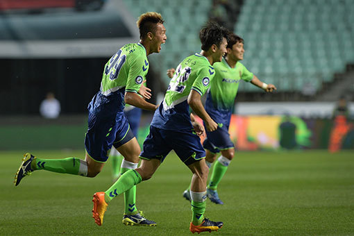 전북현대 김신욱(왼쪽)이 8일 전주월드컵경기장에서 벌어진 울산현대와의 K리그 클래식 19라운드 홈경기 후반 24분 4-0 승리를 완성하는 프리킥 골을 터트린 뒤 환호하고 있다. 김신욱이 3년 만에 맛보는 프리킥 골이었다. 사진제공|전북현대