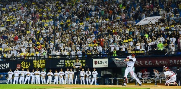 9일 서울 잠실야구장에서 열린 ‘2017 타이어뱅크 KBO리그’ LG트윈스와 한화이글스의 경기에서 LG가 7회초 갑작스러운 폭우로 3-2 강우콜드승을 거뒀다. 이병규가 경기 후 열린 영구결번식에서 안타를 치고 있다.