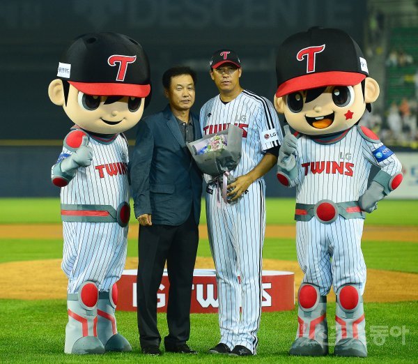 9일 서울 잠실야구장에서 열린 ‘2017 타이어뱅크 KBO리그’ LG트윈스와 한화이글스의 경기에서 LG가 7회초 갑작스러운 폭우로 3-2 강우콜드승을 거뒀다. 이병규가 경기 후 열린 영구결번식에서 LG 구단 최초 영구결번자인 김용수 전 코치와 기념촬영을 하고 있다.