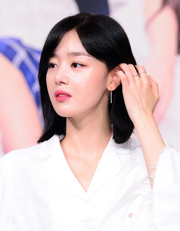 배우 한선화가 기자간담회에서 머리를 만지고 있다.