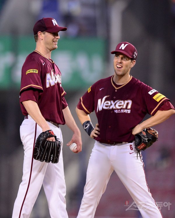 11일 잠실야구장에서 ‘2017 타이어뱅크 KBO 리그’ 넥센히어로즈와 두산베어스의 경기가 열렸다. 선발 투수로 등판한 넥센 밴헤켄이 4회말 1사 두산 정진호의 타구을 수비하다 글러브에 맞자 놀란듯 대니돈과 웃고 있다.