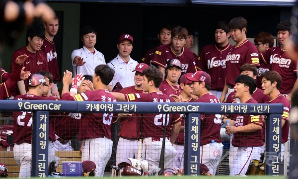 11일 잠실야구장에서 ‘2017 타이어뱅크 KBO 리그’ 넥센히어로즈와 두산베어스의 경기가 열렸다. 2회초 2사 넥센 박동원이 좌월 솔로 홈런을 날리고 그라운드를 돌아 홈인해 더그아웃에서 하이파이브 하고 있다.