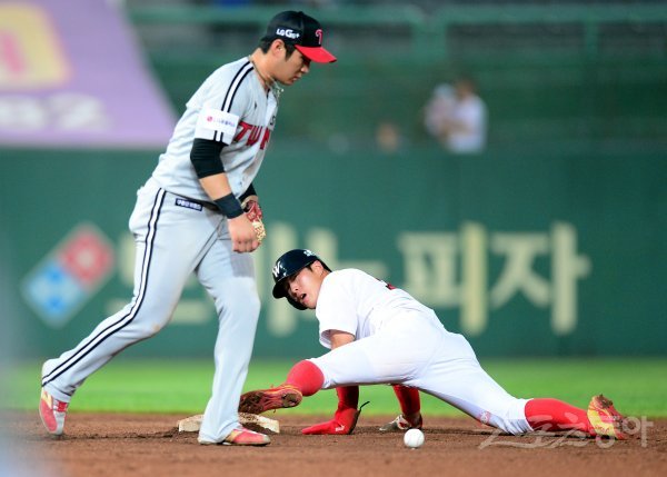 11일 인천 SK행복드림구장에서 ‘2017 타이어뱅크 KBO리그’ SK 와이번스와 LG 트윈스의 경기가 열렸다. 5회말 무사 1루에서 SK 정진기 타석 때 1루 주자 노수광이 2루 도루에 성공하고 있다.