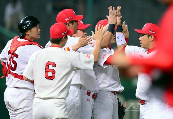 11일 인천 SK행복드림구장에서 ‘2017 타이어뱅크 KBO리그’ SK 와이번스와 LG 트윈스의 경기가 열렸다. SK 가 LG에 6-1로 승리한 뒤 선수들이 그라운드에서 기쁨을 나누고 있다.