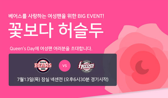 프로야구 두산베어스가 13일(목) 잠실에서 열리는 넥센과의 홈경기에서 여성 팬을 위한 '퀸스 데이(Queen’s Day)' 이벤트를 진행한다.