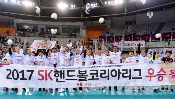 2017 SK핸드볼 코리아리그 여자부 챔피언결정전 최종전 서울시청과 SK슈가글라이더즈 경기가 12일 서울 송파구 SK핸드볼 경기장에서 열렸다. 31-30 승리를 거두며 우승를 차지한 SK슈가글라이더즈 선수들이 기념촬영을 하고 있다.
