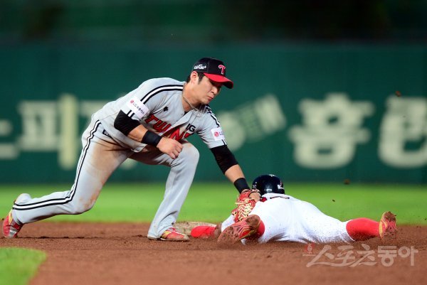 12일 인천 SK행복드림구장에서 ‘2017 타이어뱅크 KBO리그’ SK 와이번스와 LG 트윈스의 경기가 열렸다. 4회말 2사 1루에서 SK 정진기 타석 때 1루 주자 노수광이 2루 도루를 시도했으나 LG 오지환에게 태그 아웃되고 있다.