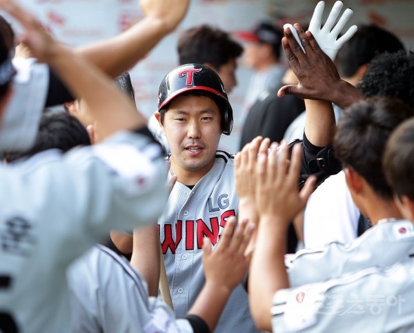 13일 인천 SK행복드림구장에서 ‘2017 타이어뱅크 KBO리그’ SK와이번스와 LG트윈스의 경기가 열렸다. 1회초 선두타자로 나온 LG 백창수가 SK 선발 윤희상을 상대로 솔로홈런을 친 후 더그아웃에서 동료들의 축하를 받고 있다.