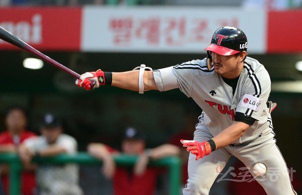 13일 인천 SK행복드림구장에서 ‘2017 타이어뱅크 KBO리그’ SK와이번스와 LG트윈스의 경기가 열렸다. 4회초 1사 만루에서 LG 박용택이 자신의 파울 타구에 맞고 있다.
