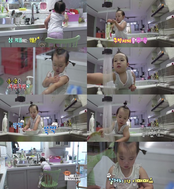 로희는 주방 싱크대 앞에 있는 의자 위로 올라가더니 주방 세제로 온몸을 구석구석 닦기 시작한다. 주방 세제로 사고를 칠까 걱정했던 우려와는 달리 로희는 곧 이어 고사리 손으로 접시를 닦기 시작했다. 무거운 그릇을 들기엔 부족한 힘과 짧은 팔로 힘이 들어 보이지만 야무지게 설거지하는 모습이 보는 이들을 미소짓게 했다.