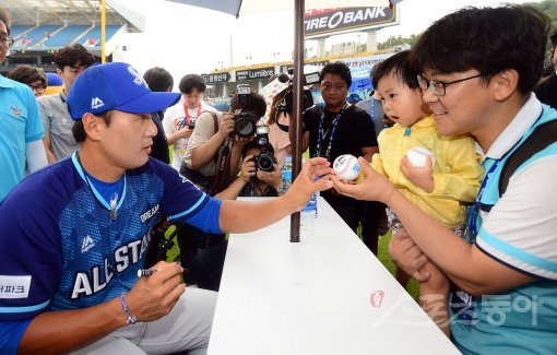 15일 대구 삼성라이온즈파크에서 ‘2017 타이어뱅크 KBO리그 올스타전’이 열린렸다. 삼성 이승엽이 경기를 앞두고 열린 사인회에서 팬들에게 사인을 해주고 있다. 대구 | 김진환 기자 kwangshin00@donga.com