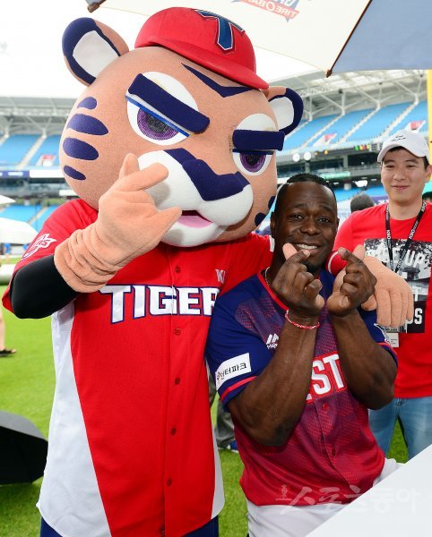 15일 대구 삼성라이온즈파크에서 ‘2017 타이어뱅크 KBO리그 올스타전’이 열린렸다. 경기를 앞두고 열린 사인회에서 KIA 버나디나가 마스코트와 포즈를 취하고 있다. 대구 | 김진환 기자 kwangshin00@donga.com