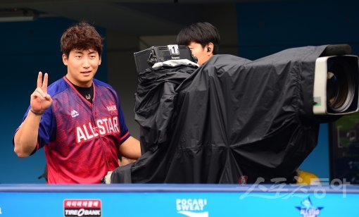 15일 대구 삼성라이온즈파크에서 ‘2017 타이어뱅크 KBO리그 올스타전’이 열린다. 올스타전을 앞두고 나눔팀 NC 나성범이 방송 카메라를 만지며 환하게 웃고 있다. 대구 | 김진환 기자 kwangshin00@donga.com