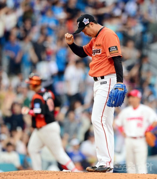 15일 대구 삼성라이온즈파크에서 ‘2017 타이어뱅크 KBO리그 올스타전’이 열렸다. 나눔팀 한화 배영수가 연속 홈런을 허용한 후 고개를 떨구고 있다. 대구 | 김진환 기자 kwangshin00@donga.com
