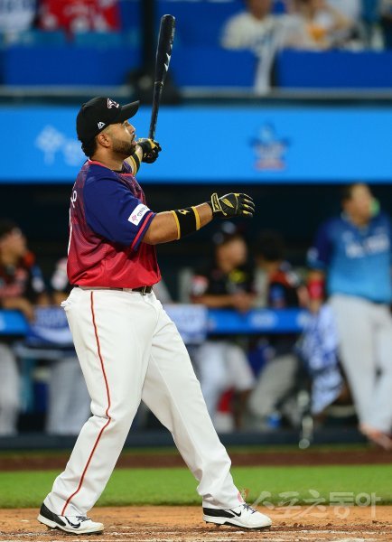 15일 대구 삼성라이온즈파크에서 ‘2017 타이어뱅크 KBO리그 올스타전’이 열렸다. 5회말이 끝난 후 열린 홈런 레이스 결승전에서 나눔팀 한화 로사리오가 8개를 치며 우승과 함께 140m로 비거리상까지 수상했다. 로사리오가 스윙 후 타구를 응시하고 있다. 대구 | 김진환 기자 kwangshin00@donga.com