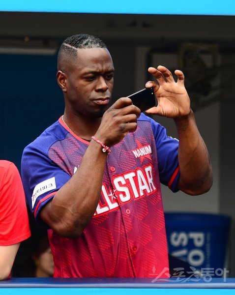 15일 대구 삼성라이온즈파크에서 ‘2017 타이어뱅크 KBO리그 올스타전’이 열렸다. 나눔팀 KIA 버나디나가 스마트폰으로 퍼펙히 히터 장면을 찍고 있다. 대구 | 김진환 기자 kwangshin00@donga.com